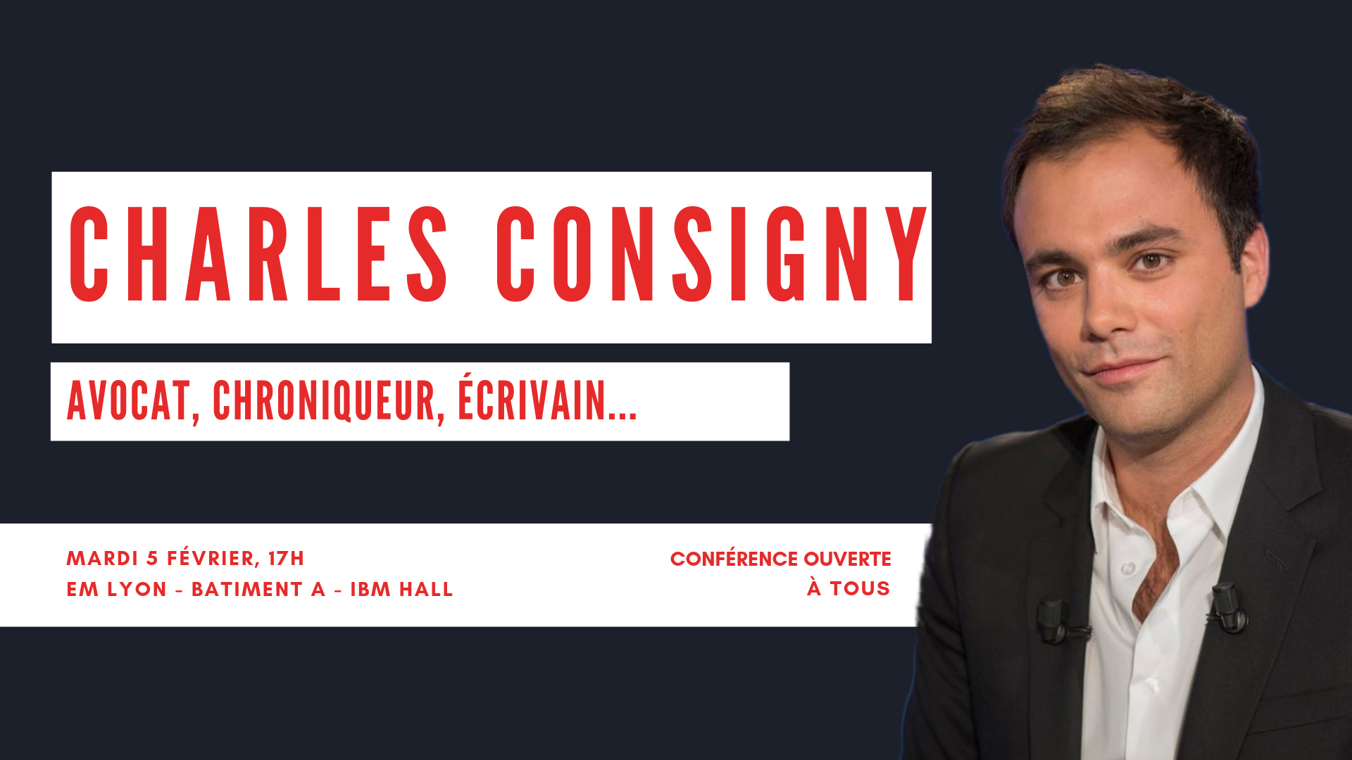 Forum emlyon reçoit Charles Consigny le 5 février pour une conférence / débat sur les médias, la justice, la politique et une foule d’autres sujets !